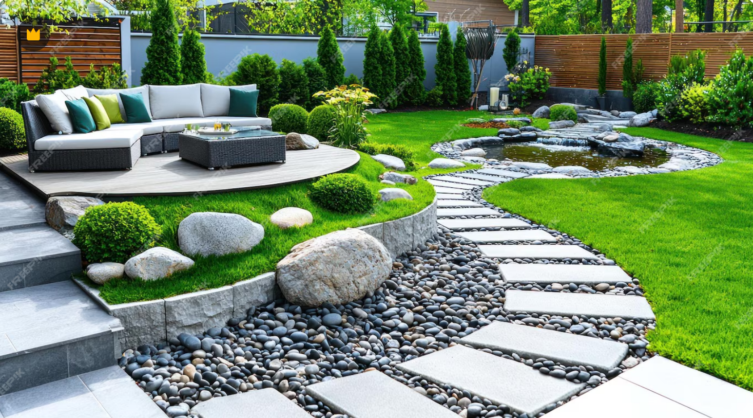 Мощение дорожек, установка заборов, создание зон отдыха и установка малых архитектурных форм.